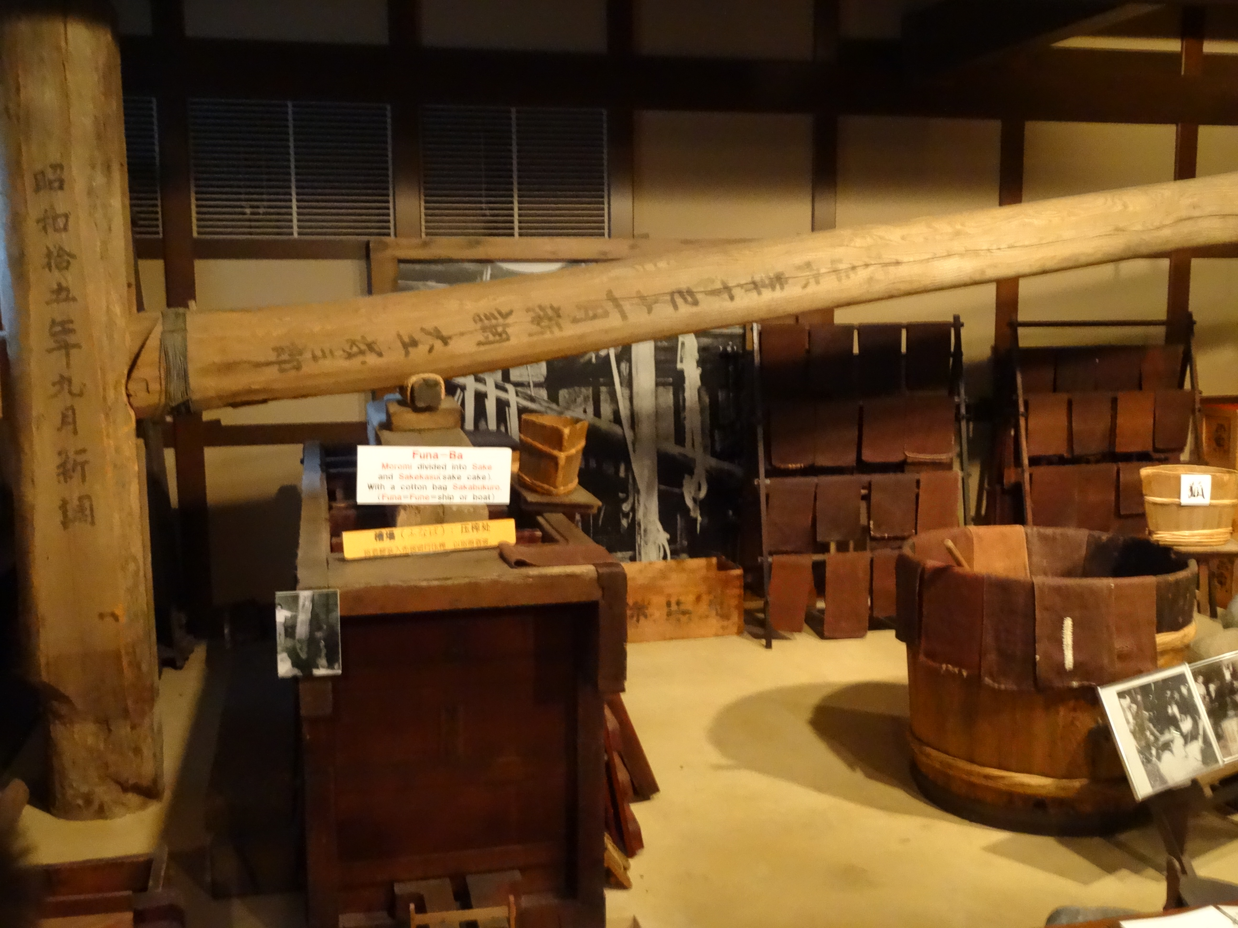 Der noch weiße Sake-Brei wurde hier durch Leinen-Tücher gepresst damit glasklare Sake heraus kam. Durch den langen Hebel wurde der Pressdruck enorm gesteigert.