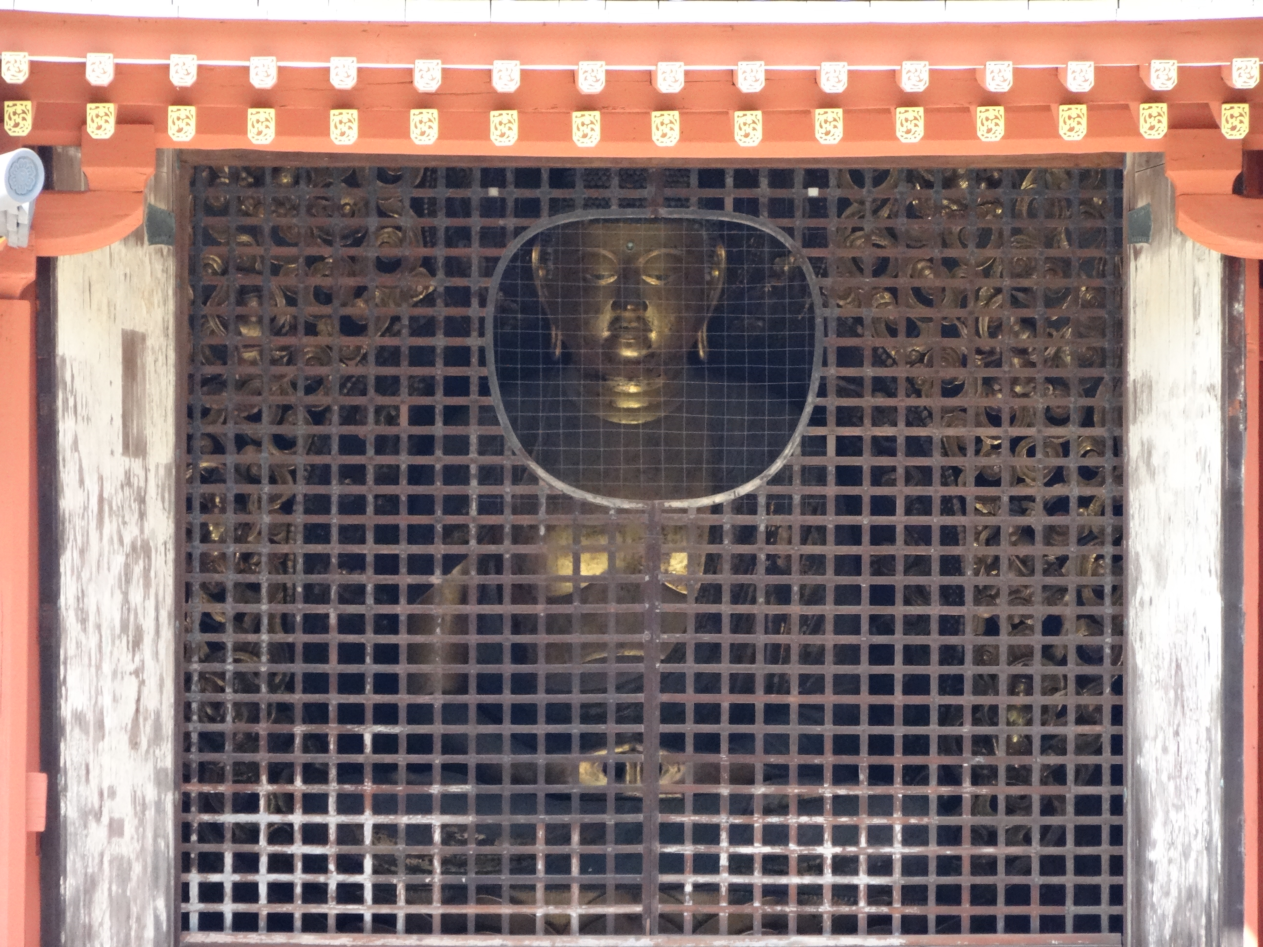 Aus einer bestimmten Position kann man den Buddha durch das Fenster über dem Haupteingang sehen.
