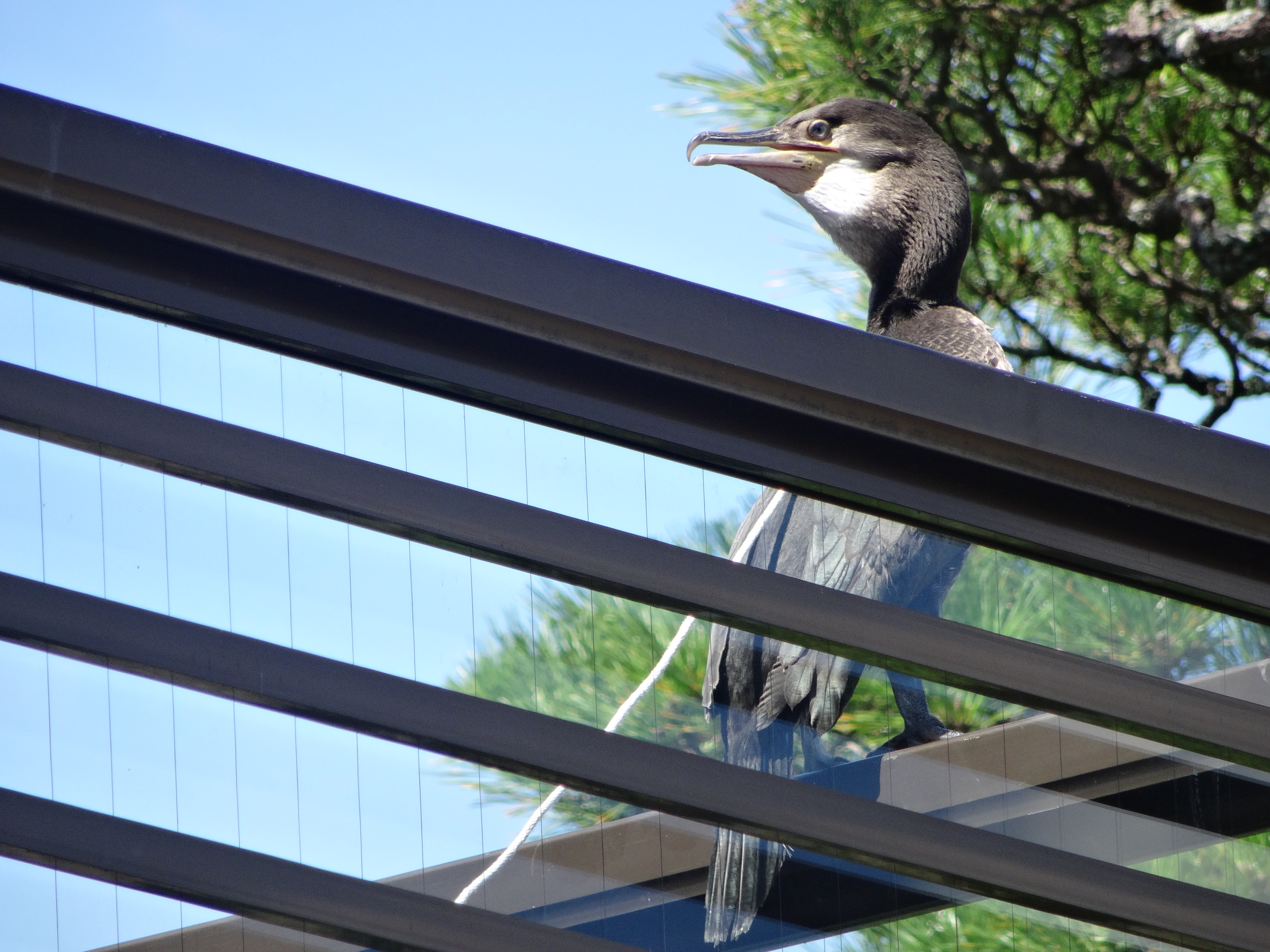 Wir waren in einem Tee-Haus zu einer Tee-Zeremonie. Im Vorraum war ein Video zu sehen, wie der Kormoran aus dem Ei schlüpfte und per Hand aufgezogen wurde. Auf dem Balkon des Hauses habe ich den Kormoran entdeckt. Leider nicht so schön, daß er mit einer Schnur festgebunden ist.