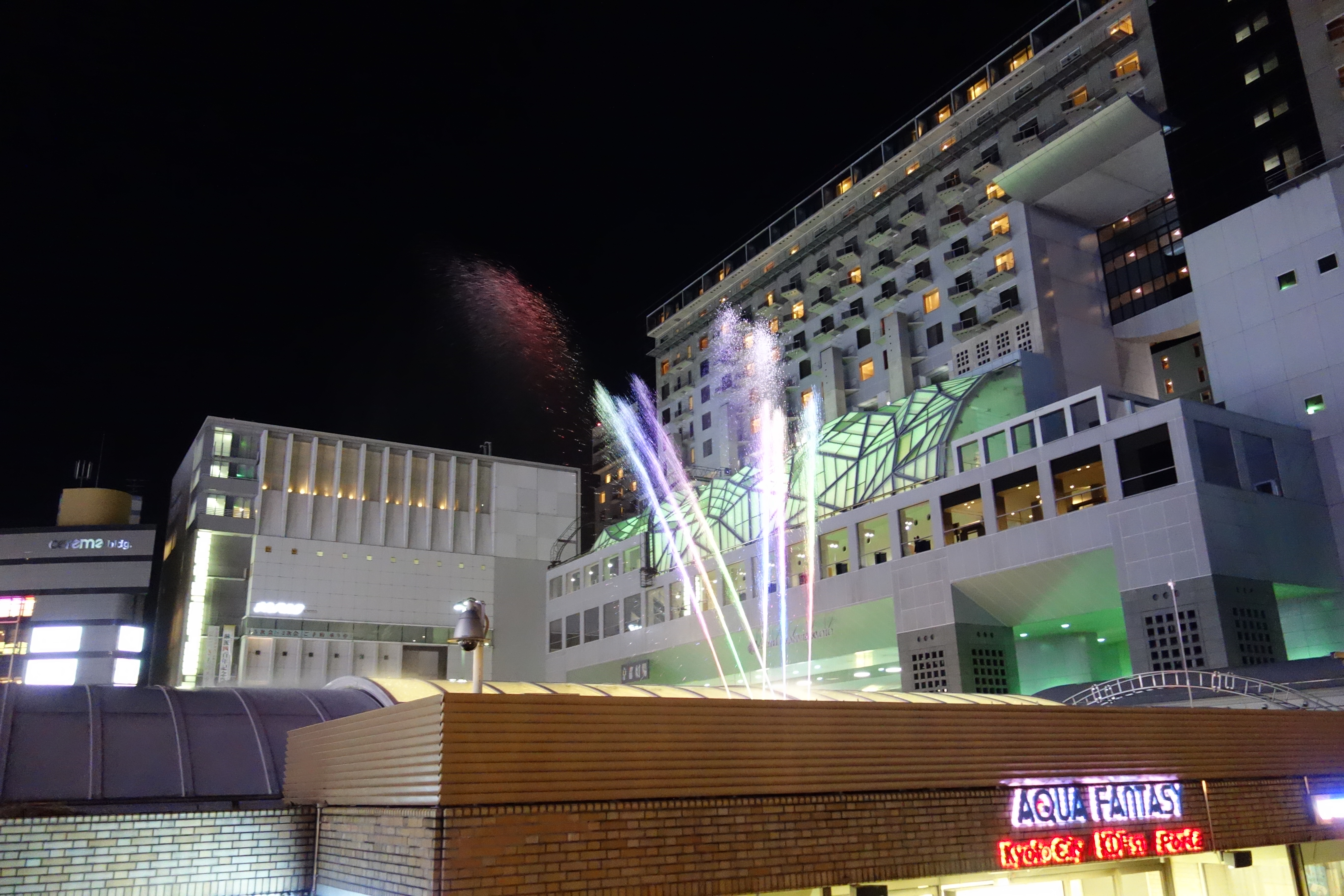 Die Kyoto-Station, der Hauptbahnhof von Kyoto, bietet viele Überraschungen. Wenn man meint, man kennt alles, entdeckt man schon wieder etwas neues. Hier haben wir am späten Abend ein Wasser-Spiel entdeckt. Es wird farbenfroh beleuchtet und spritzt Muster aus Wasser zum Takt der Musik.